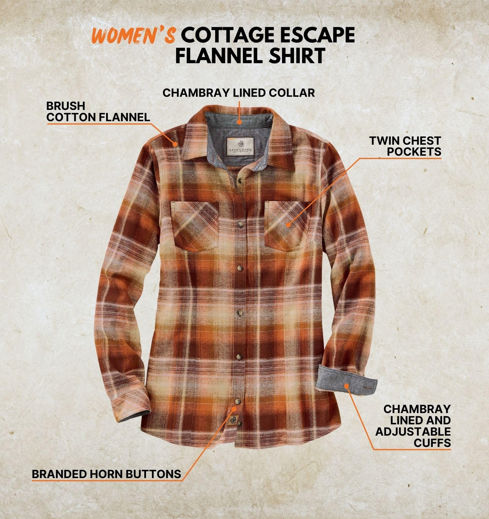 - FEATURES: A classic flannel design, custom Legendary brand buttons, twin chest pockets, fabric darts for a flattering fit and adjustable cuffs